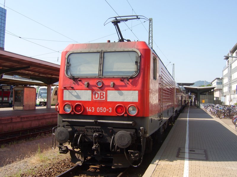 143 050-3 ist die Schublok der Regionalbahn nach Seebrugg. Direkt hinter ihr ist ein ehem DDR Steuerwagen eingereiht (nichts Ungewöhnliches auf der Strecke). Vorne am Zug hängt eine weitere 143.