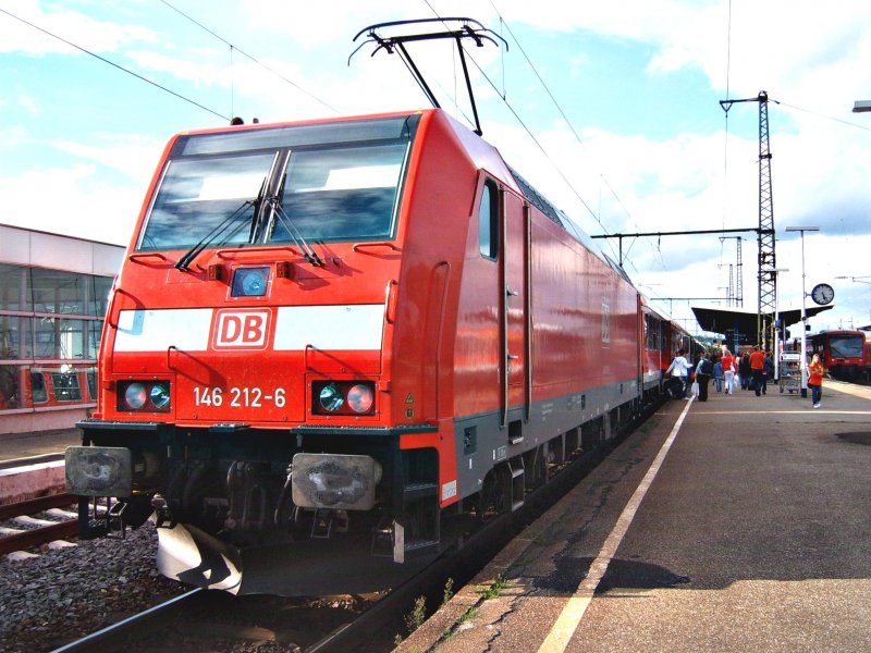 Die BR 146 212-6 im Knotenbahnhof Aalen: die Zug fuhr am 30.08.06 im Wendezugbetrieb in den Bahnhof ein. Zehn Minuten später setzte der RegionalExpress seine Reise nach Stuttgart Hbf fort.