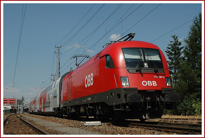 Gegen die Regeln der Wiener Schule: 1116 267 mit einer Doppelstockgarnitur bei der Ausfahrt aus Wien Liesing Richtung Wiener Neustadt am 24.7.2006