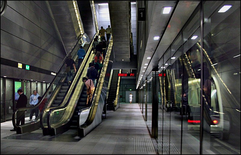Im Gegensatz zu den oberidischen Stationen sind die Tunnelstationen mit gläsernen Bahnsteigwänden und -Türen versehen, um Personenunfälle zu vermeiden. Haltestelle Forum.