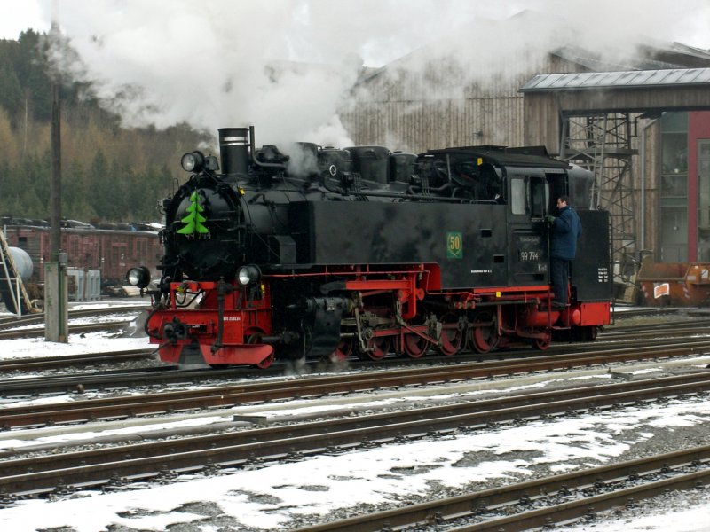 99 794 beim Rangieren im Bahnhof Oberwiesenthal, hier noch mit ihrem Weihnachtsfestkleid. Oberwiesenthal 28.12.2006