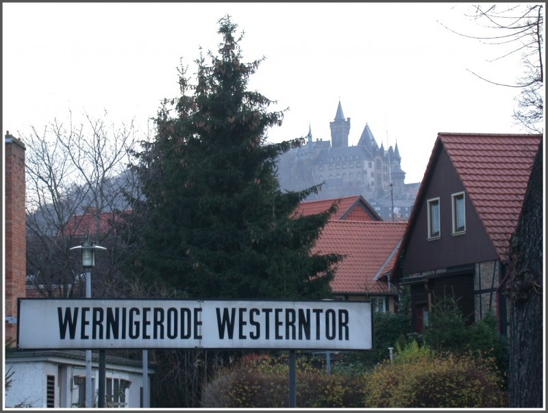 Zwischen Bäumen und Häusern erspäht man mit etwas Glück vom Bahnsteig in Wernigerode Westerntor das Schloss jenseits der Altstadt. Der Aufstieg lohnt sich, denn die Aussicht auf die Stadt ist überwältigend. (13.12.2006)