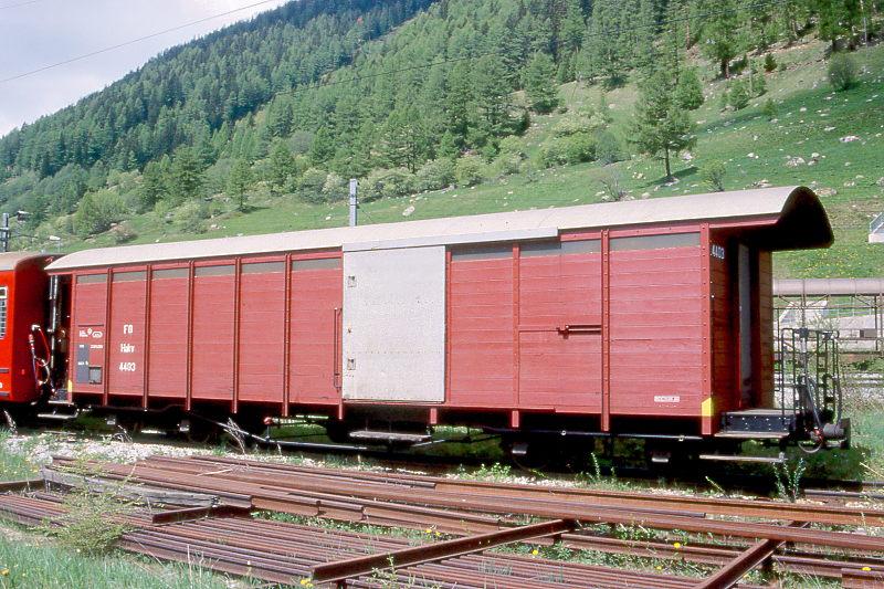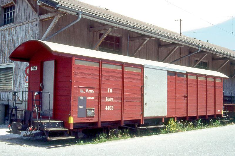 FO - Hakv 4403 am 17.06.1995 in BRIG - GÜTERWAGEN gedeckt, Sonderbauart - 2 offene Plattformen - Zugsammelschiene - Untergestell Baujahr 1914 - SIG - Gewicht 11,30t - Zuladung 10,00t - LüP 15,20m - zulässige Geschwindigkeit km/h 60 - ®3=01.06.1989 - Lebenslauf: exFZ4 353 - 1959 FZ4 4353 - 1962 J 4403 - 1971 neuer Kasten Hakv 4403. Hinweis: von 10 ehemaligen FZ-Wagen Baujahr 1914 wurden 3 Stück 1959 bis 1962 in Güterwagen umgebaut mit den Betriebsnummern 4401 - 4403. Später mit neuen Kästen modernisiert.