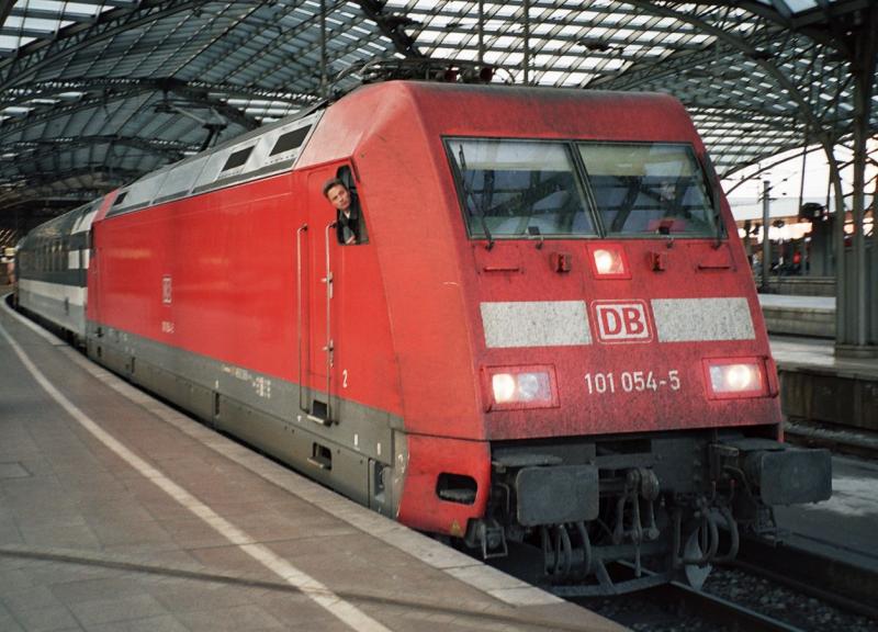 101 054 bei der Abfahrt in Richtung Düsseldorf auf Köln.