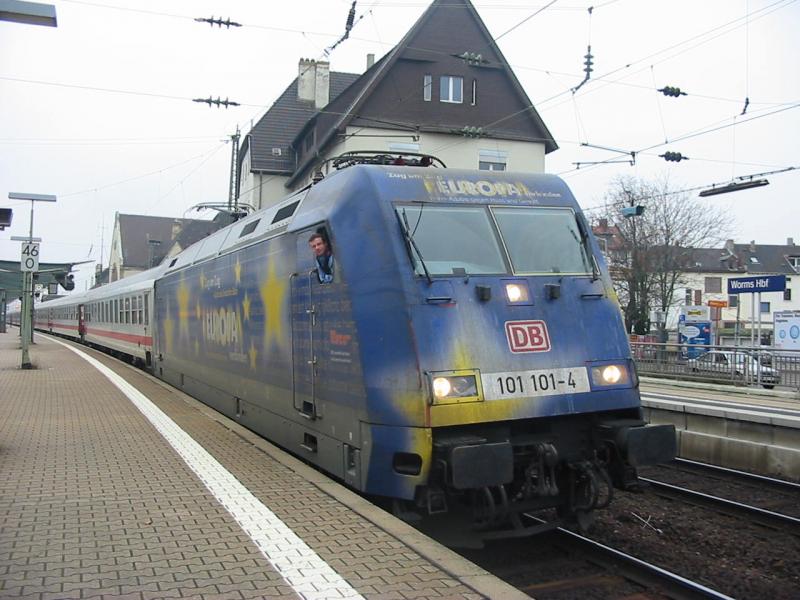101 007 fuhr am 9.1.06 mit ihrem EC übers Gleis 5 in Worms.