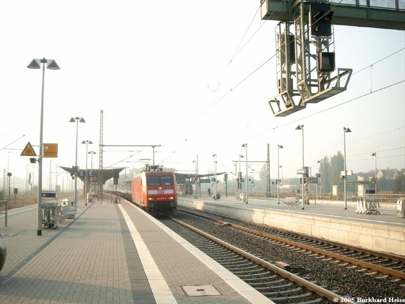 145 039-4 durchfahrt mit einem Güterzug am Morgen des 25.9.2005 den Bahnhof von Wittenberge. Man beachte die Zugzielanzeige "Köln Hbf"!!!