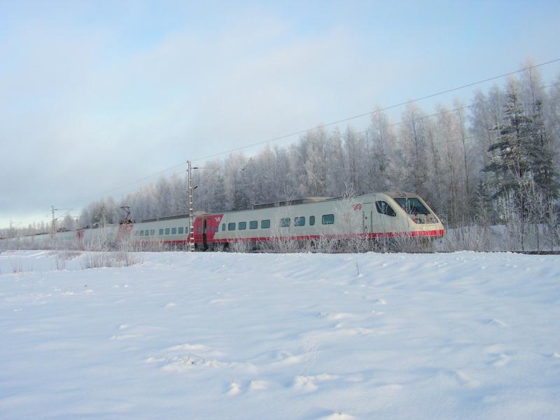 Am 8.1.06 rollt gegen 12 Uhr der finnische Schnellzug "pendolino" durch das kleine finnische Dorf Lamminkoski bei Parkano.