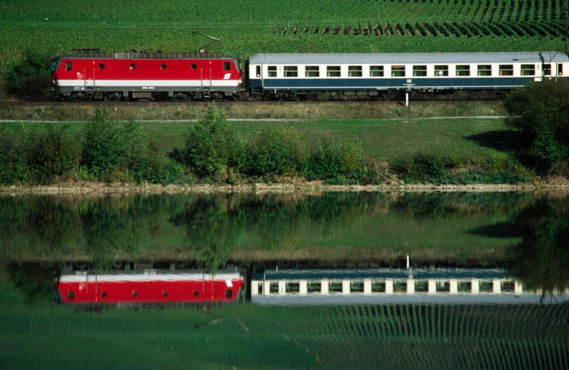 Auf der alten KBS 800 ist am 4. Oktober 1991 die ÖBB-Ellok 1044 216 im km-Ausgleich für 103-Durchläufe bis Wien-Westbahnhof mit EC 28 "Prinz Eugen" soeben aus Würzburg Hbf abgefahren und passiert einen Fischteich bei Thüngersheim am Main in Richtung Frankfurt am Main
