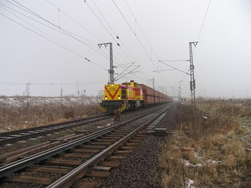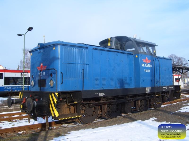 PE Cargo V60.09 im Bahnhof Pritzwalk. Der Zug hat eine Leistung vom Ausbesserungswerk Wittenberge nach Pritzwalk überführt, die nun mit den PE Cargo Loks 212 279 + 212 314 nach Wustermark weitertransportiert wird.