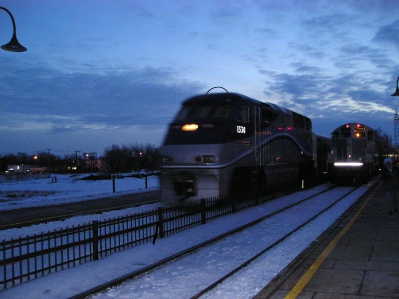 Große Lokomotive: Pendlerzug der AMT (Agence métropolitaine de transport)-Linie: Montréal-Dorion-Rigaud auf der Fahrt Richtung Flughafen Dorval im Bahnhof Vendôme.