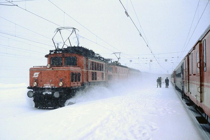 ÖBB 1020.44 + 1044.24 mit Ex 469 "Arlberg-Express", Langen am Arlberg, 04.01.1985