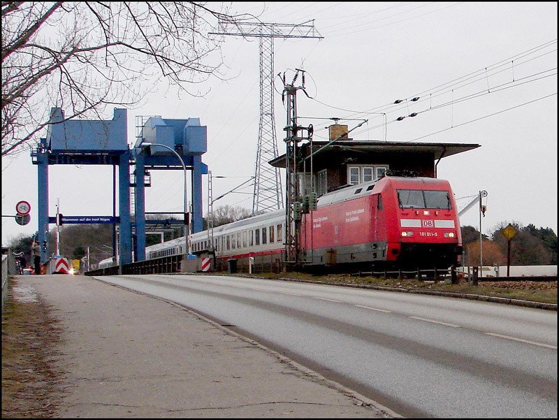 101 011-5 überquert gerade mit IC2454 die Ziegelgrabenbrücke. (Stralsund am 22.02.06)