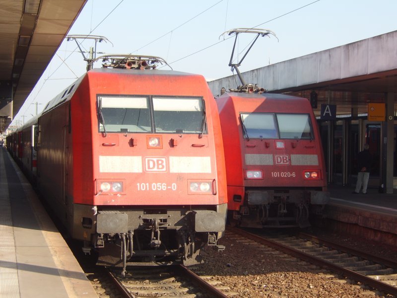 101 056-0 mit IC 2145 nach Leipzig, und daneben 101 020-6 in Hannover HBF. Leider konnte ich das Ziel von 101 020-6 nicht ausmachen , da dieser Zug wegen einer Streckensperrung mit viel Verspätung in Hannover einfuhr.