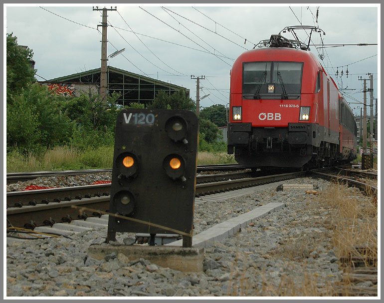 1116 078 mit dem IC 534 "Naturpark Grebenzen" am 1.7.2006 kurz nach der Durchfahrt der S-Bahnstation Atzgersdorf-Mauer. In wenigen Minuten wird sie mit ihrem IC in Wien-Meidling einfahren.