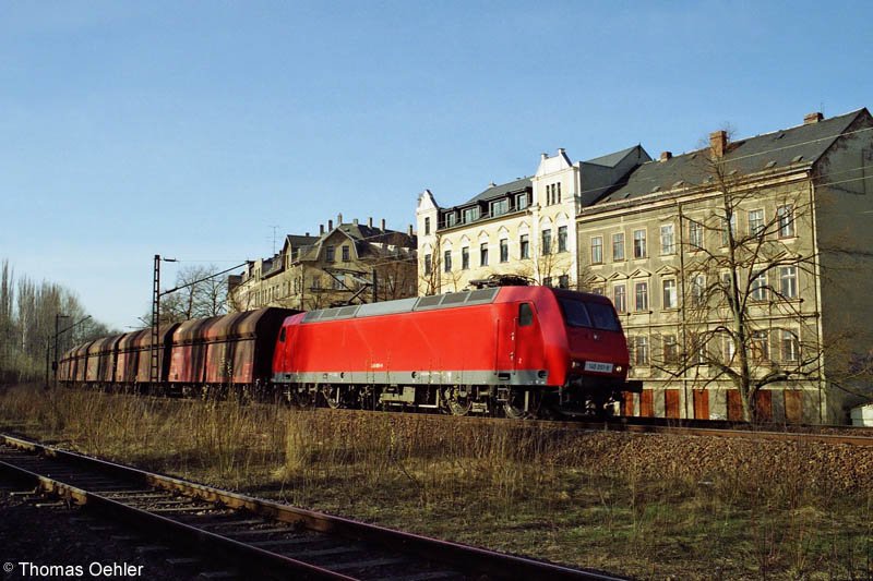 241 353 zieht hier den Kohleleerzug Richtung Chemnitz/Siegmar. Die Aufnahme am 25.02.06 zeigt sie gerade zwischen Brücke Zschopauer Str.(im Hintergrund) und Chemnitz/Süd.