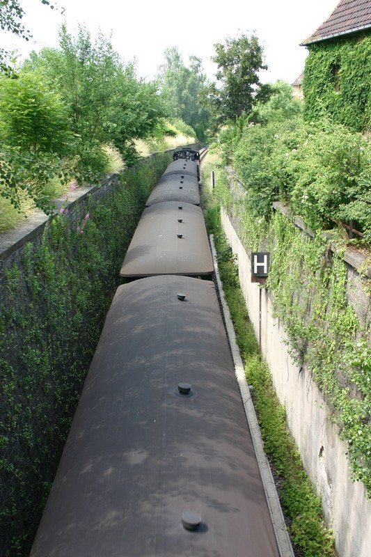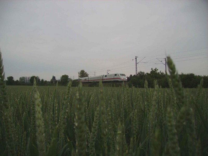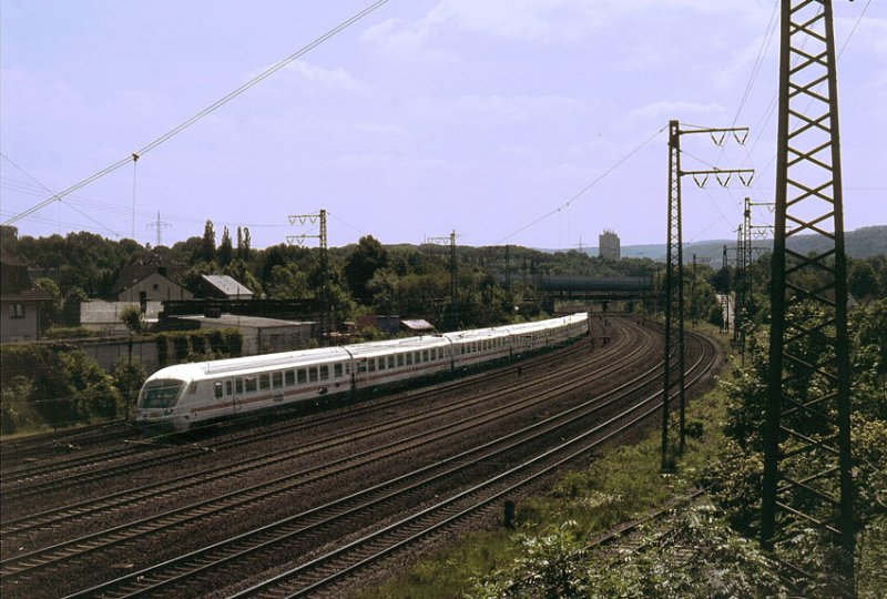 Problematisch den Zug bei dem Tempo überhaupt ganz auf das Bild zu bekommen. Aufn. mit alter Minolta-Spiegelreflex 1/1000 sec/ f=50mm. Juni 2006.
