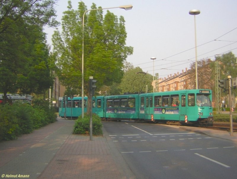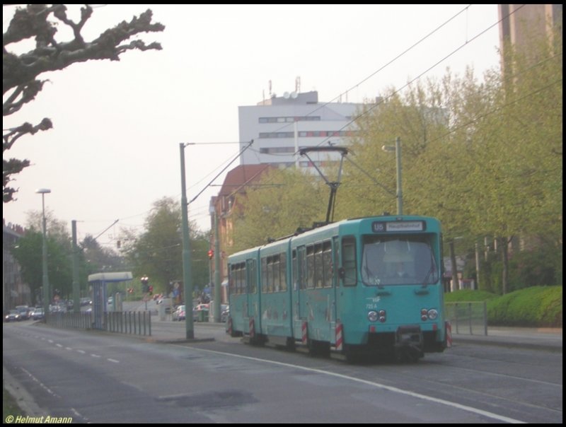 Die Linie U5 vom Hauptbahnhof nach Preungesheim hat nur vier unterirdische Stationen, der Rest der Strecke verläuft oberirdisch auf weitgehend eigenem Gleiskörper. Am 06.05.2006 fuhr der Ptb-Triebwagen 700 auf dem 4. Zug nach Preungesheim in die Station