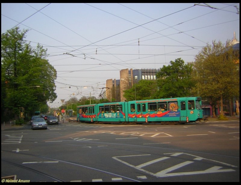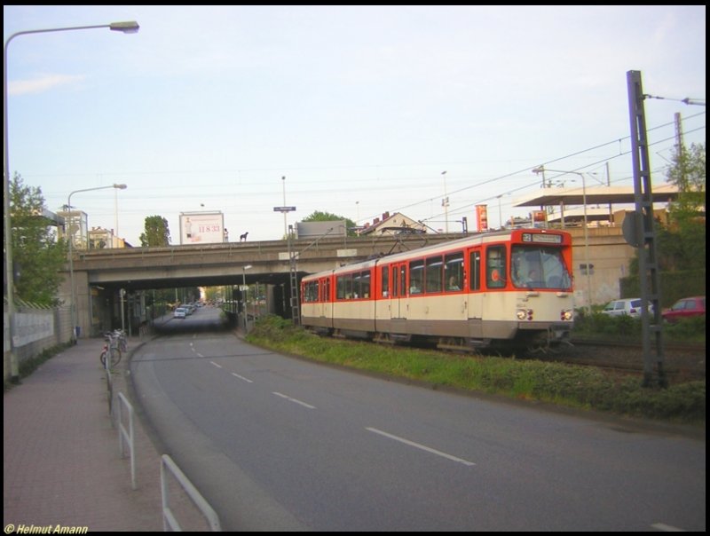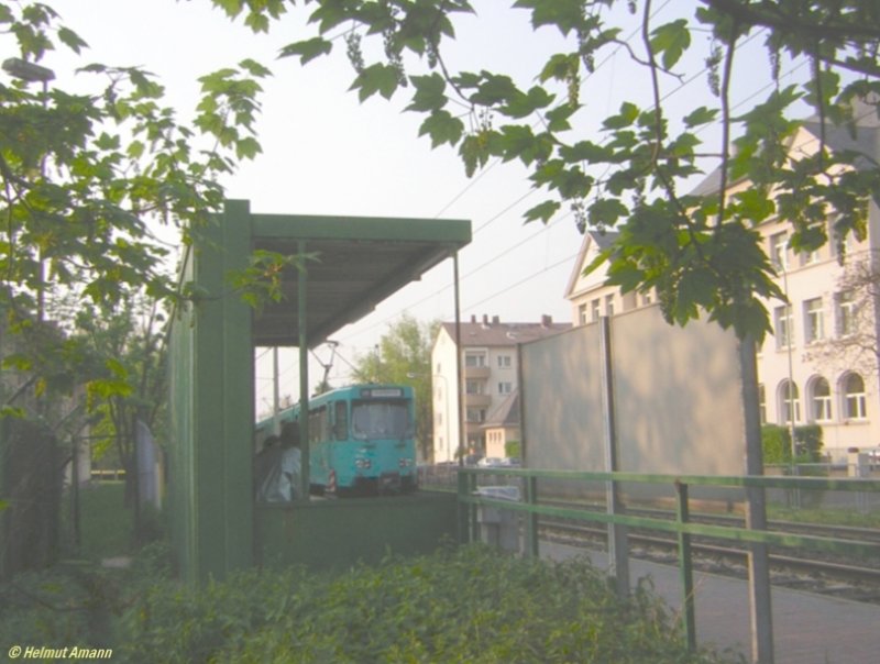 Der Pt-Triebwagen 683 hatte am 12.05.2006 auf dem 6. Zug der Linie 12 gerade die unter dem Bahnhof Frankfurt - Niederrad gelegene Haltestelle Niederrad Bahnhof verlassen und nahm Fahrt auf in Richtung Schwanheim.
