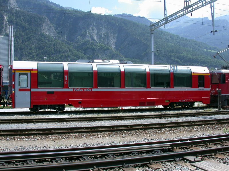 Api 1304 ist ein fabrikneuer 1.Klasse Panoramawagen der RhB, hier eingereiht in einen Güterzug in Untervaz (03.07.2006)