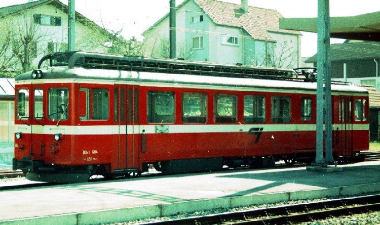 CJ Schmalspur Triebwagen BDe 4/4 604 im Bahnhof von Saignelègier im April 1981
