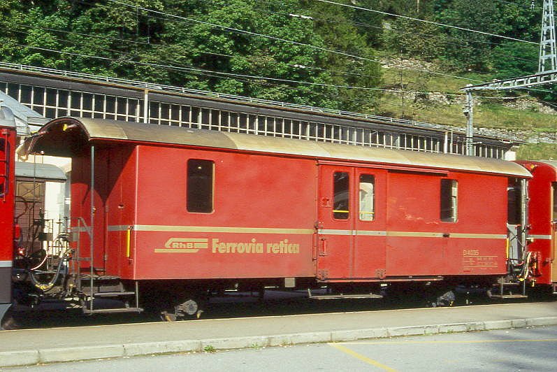 D² 4035 II - Gepäckwagen am 05.09.1996 in Poschiavo - Baujahr 1911 - SWS - Fahrzeuggewicht 9,00t - Zuladung 10,00t - LüP 10,69m - zulässige Geschwindigkeit 65 km/h. - ®3=04.05.1990 - RhB-Logo italienisch - Lebenslauf: ex F 4033 - 1964 D² 4033 - 04.05.1990 D² 4035II - ? Abbruch - Hinweis: gescanntes Dia