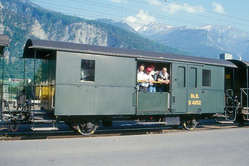 D² 4052 I - Gepäckwagen am 23.05.1998 in Untervaz - Baujahr 1897 - SIG/RhB - Fahrzeuggewicht 8,00t - Zuladung 10,00t - LüP 9,54m - zulässige Geschwindigkeit 60 km/h.- ®2=03.03.1995 - Lebenslauf: ex A 6 - 1911 A 21 - 1926a - 1928 Umbau zu F 4052 - 1964 D² 4052 I - 1973 historisches Fahrzeug - 07/1998 Entgleisung Grüsch (Kasten bei Aufprall auf Gittermasten schwer beschädigt) - 1999 Abbruch - Hinweis: gescanntes Dia