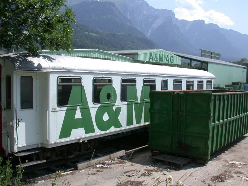 Die Firma A&M Recycling verschrottet nicht nur alte RhB Wagen, sondern benützt einen alten Vierachser auch für andere Zwecke, vermutlich als Aufenthaltsraum oder Cafeteria. Untervaz (03.07.2006)