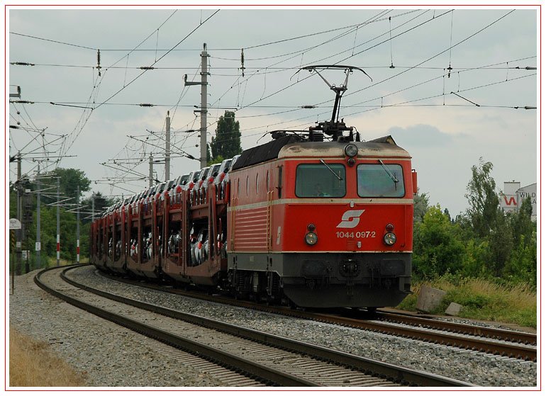 Eine der wenigen 1044iger, nämlich 1044 097-2, die ihren Altlack noch besitzen, kam mir am 1.7.2006 kurz vor Atzgersdorf-Mauer mit einem Autoganzzug vor die Linse.