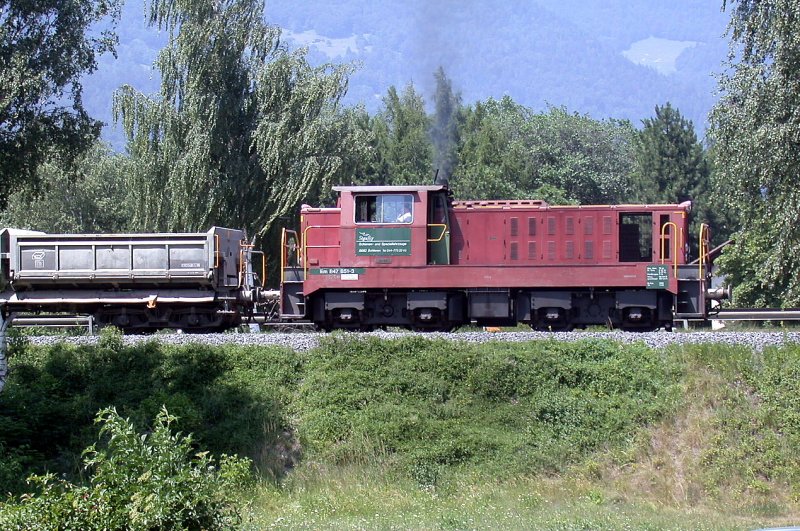 Em 847 851-3 der Cementwerke Untervaz schiebt einen Zug aus Schotter- und Cementsilowagen vom Übergabebahnhof bei Untervaz rückwärts über den Rhein ins Gelände der Holcim. (03.07.2006)