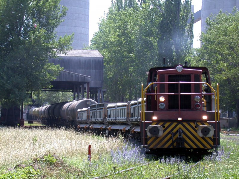 Em 847 851-3 schiebt ihren Zug durch blühende Wiesen ins Holcim Werk. (03.07.2006)