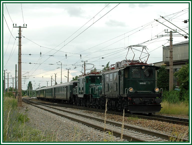 Für die Tour O 22 der ÖBB Nostalgie wurden am 1.7.2006 die beiden Maschinen 1100.102 und 1145.02 herangezogen. Das Bild zeigt den Sonderzug R 16409 von Wien nach Mürzzuschlag, kurz vor der Durchfahrt der S-Bahnstation Atzgersdorf-Mauer.