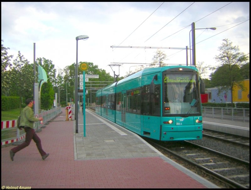 Jetzt aber schnell: Der Fahrer des 3. Zuges der Linie 21 zur Mönchhofstraße hatte am 13.05.2006 die Türen des S-Triebwagens 248 an der Haltestelle Heinrich-Hoffmann-Straße / Blutspendedienst bereits geschlossen, gab sie aber für den in letzter Sekunde auf die Bahn zueilenden Fahrgast nochmal frei.