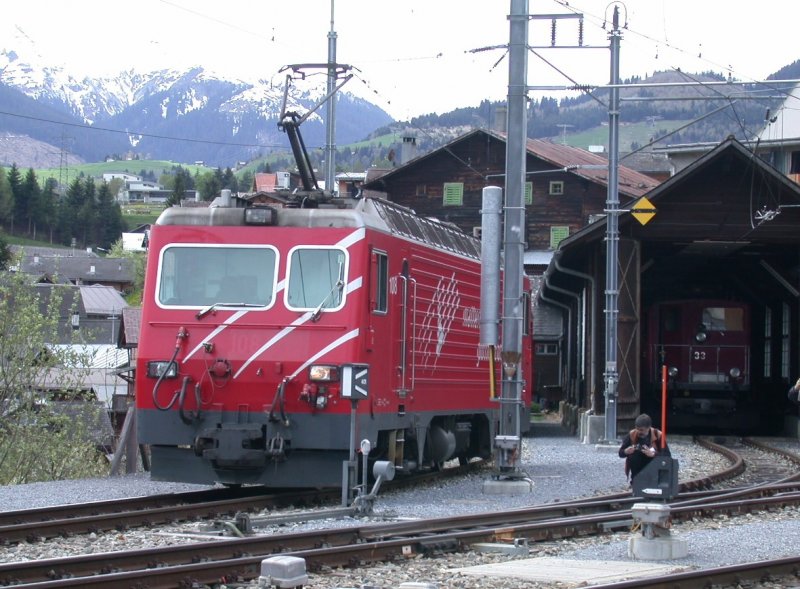 MGB HGe 4/4 II 108 vor dem Lokschuppen in Disentis/Muster. Im Schuppen selbst ist schwach HGe 4/4 I Nr.33 zu erkennen. (10.05.2006)
