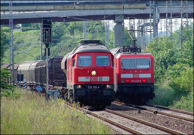 Zugbegegnung - 232 135-4 vor dem TEC55707 hat die RB (mit 143 233-5) nach Sassnitz passieren lassen. (Stralsund am 15.06.06)