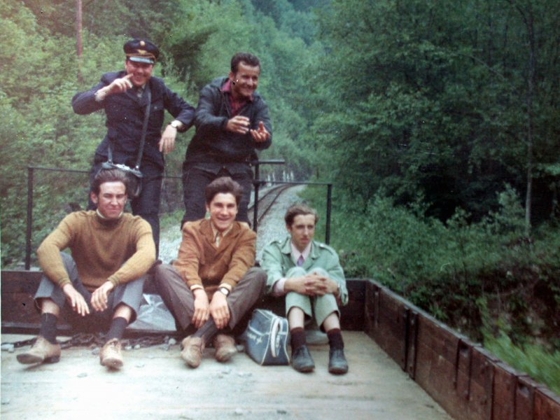 Zur Abwechslung mal ein Bild, das nicht von mir geschossen wurde, denn ich bin die Person in der Mitte. Dass es auch früher nicht nur tierisch ernst zu und her ging, zeigt dieses Bild aus dem Jahre 1970. Die Aufnahme enstand auf einem GmP der ehemaligen Wälderbahn zwischen Bezau und Bregenz, offensichtlich mit Zustimmung des sehr vergnügten ÖBB-Zugpersonals.