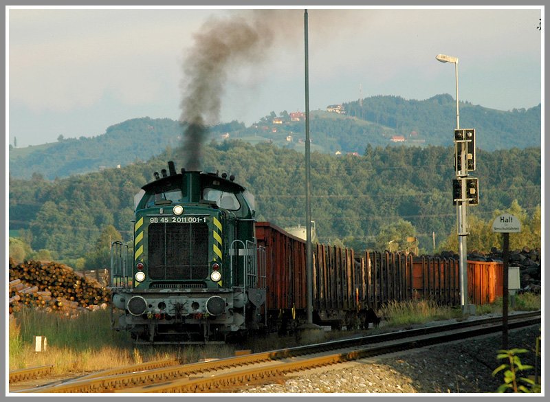 1100.1 der GKB bei der Abholung weiterer Leerwagen aus dem Werk der Holzindustrie Leitinger in Preding am 10.7.2006.