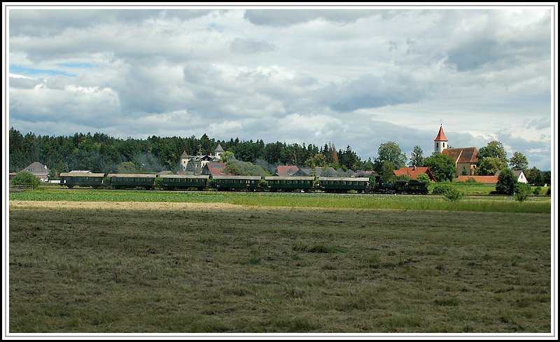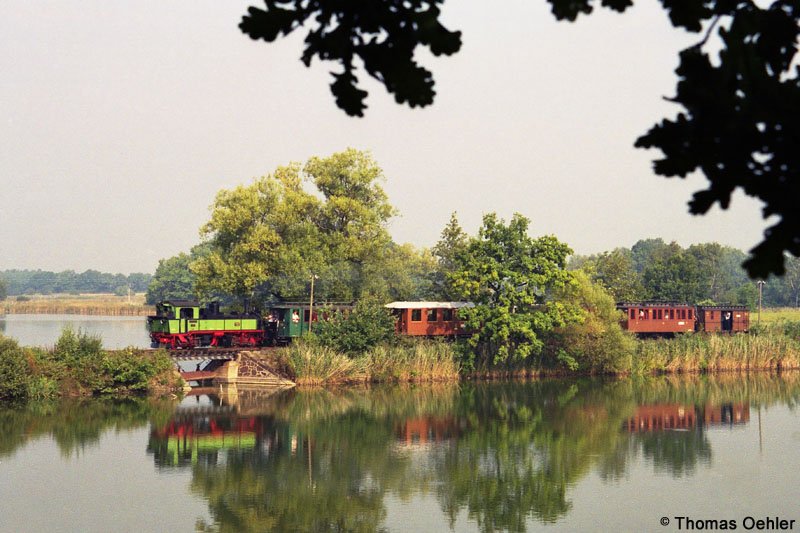 Der Traditionszug auf dem Damm über die Dippelsdorfer Teiche. Für dieses Motiv bin ich extra auf einen Baum geklettert! Das hohe Schilf rund um den Teich lässt dieses Foto sonst nicht zu. Alternative: Man müsste es von einem Ruderboot aus machen.