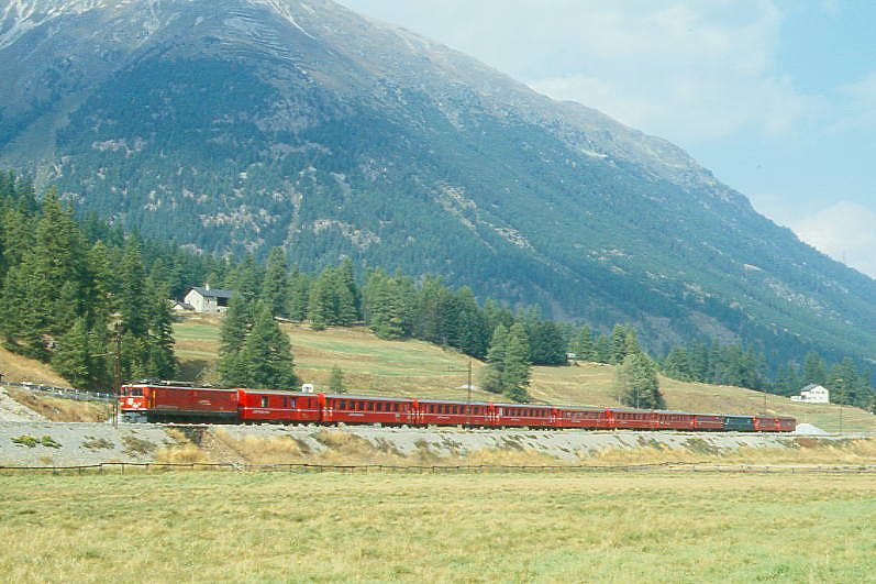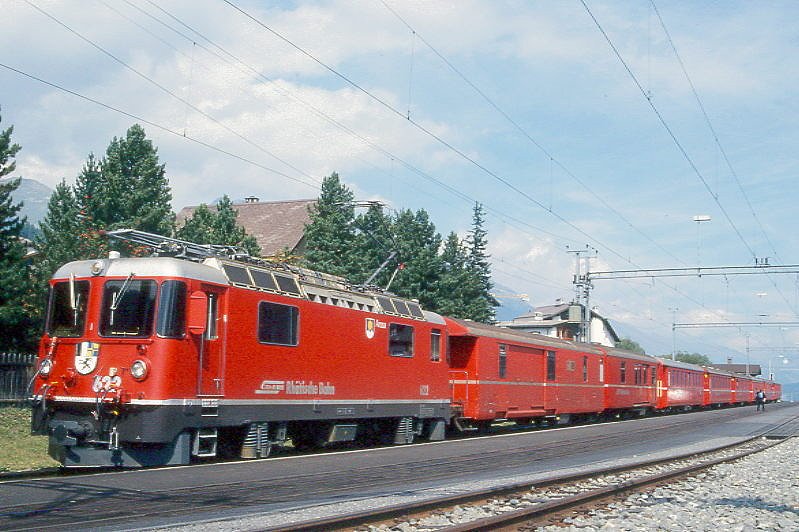 RhB Schnellzug 541 von Chur nach St.Moritz am 26.08.1998 zwischen Chur und Felsberg mit E-Lok Ge 4/4III 643 - D 4209 - B 2380 - B 2353 - B 2393 - A 1227 - A 1283 - A 1270 - B 2442 - B. Hinweis: Zug wegen Streckenunterbruch bei Foral auf falschen Gleis, gescanntes Dia