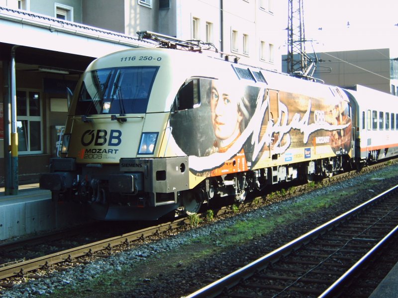 1116 250-0 jetzt im Mozartlook bringt am 22.07.2006 den IC 741 (Civtas Nova) von Salzburg nach Wien.Da mich das Auftauchen der Lok in Wels überrascht hat und der Zug nur einen kurzen Aufenthalt hatte, konnte ich nur schnell ein Foto machen und mir das Fahrzeug noch nicht so genau ansehen.
