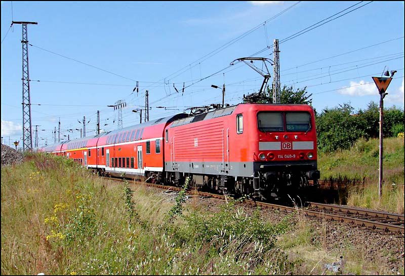 114 040-9 kommt mit dem RE38314 aus Falkenberg. (kurz vor Stralsund am 15.07.06)