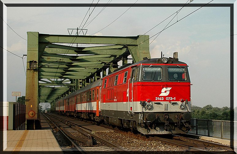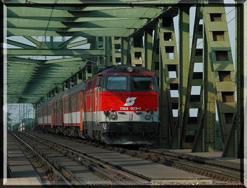 2143 073 mit dem Euregio 2535 von Bratislava kommend Richtung Wien Süd-Ost am 21.7.2006 bei der Überquerung der Donau im Bereich Praterkai.