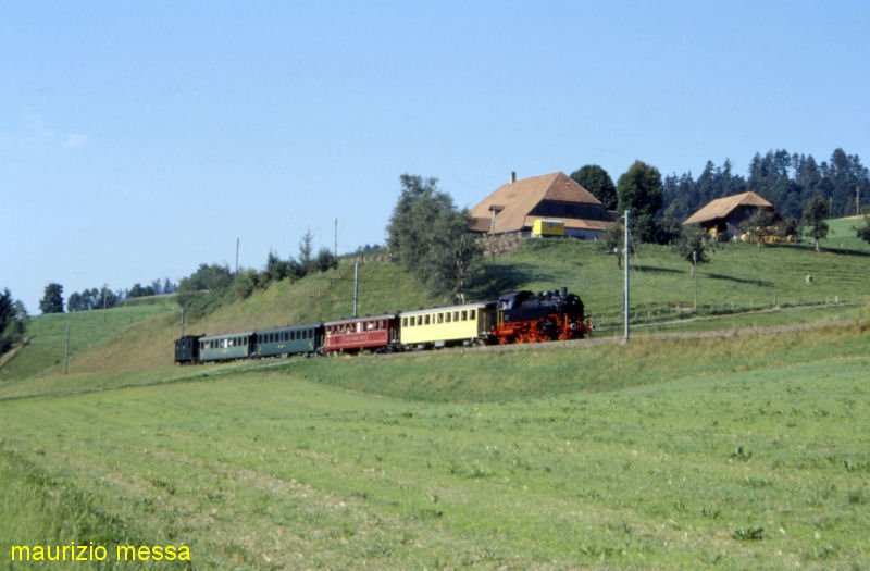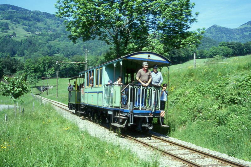 BC Museumsbahn Dampfzug 4093 von Ende Baye de Clarens-Viadukt nach Weiche-(Chaulin) am 24.05.1999 bei Cornaux mit exTN C4 121 - Dampflok exFP G 2/2 4. Hinweis: Zug geschoben, gescanntes Dia.