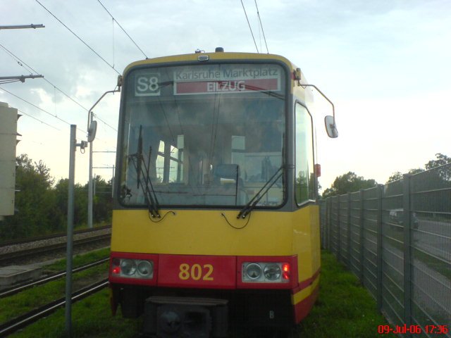 802 an der Rheinbergstraße in Karlsruhe-Knielingen als Linie S4 als EIlzug nach Bad Herrenalb. Dieses Bild entstand am 09. Juli 2006
