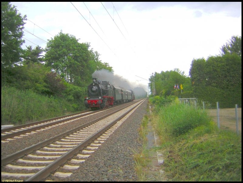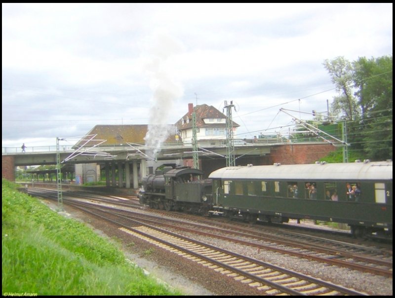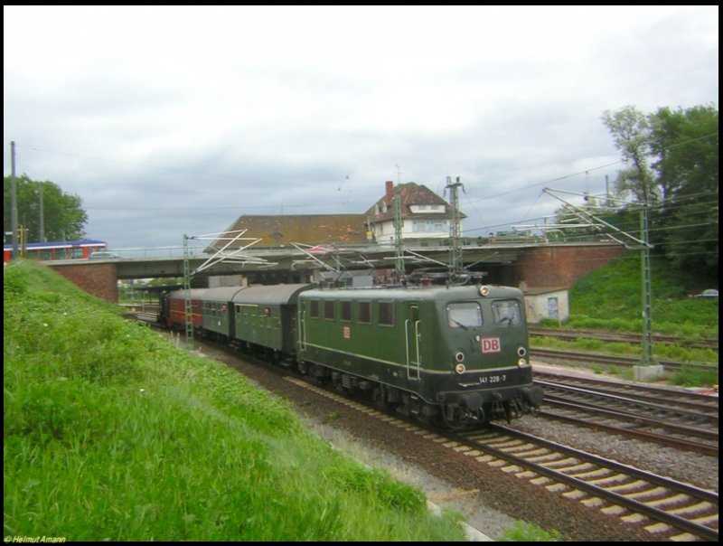 Beinahe hätte es geklappt: Als 141 228 am 27.05.2006 mit ihrem Pendelzug vom Eisenbahnmuseum Darmstadt-Kranichstein zum Hauptbahnhof den Bahnhof Darmstadt-Nord durchfuhr, hatte ein Straßenbahnzug die Brücke eine Minute zu früh überquert und damit die Hoffnung zunichte gemacht, beide Züge auf das Bild zu bekommen, der Anhänger ist am Bildrand links noch zu erkennen. Am Zugschluß hängt die V36 405, unter dem Schatten der Brücke kaum zu sehen.