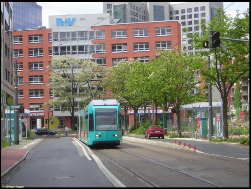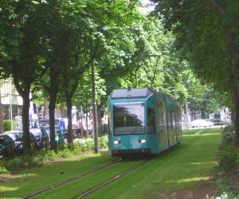 Aufgrund von Einwendungen der Anwohner und von Naturschützern durfte die Rebstockstraßenbahn im Abschnitt zwischen Varrentrappstraße und Nauheimer Straße nur eingleisig gebaut werden, um den im Bild zu sehenden Baumbestand zu bewahren. Dieser gab dem R-Triebwagen 006 als 2. Zug der Linie 17 zum Rebstockbad am 01.06.2006 auf dem Rasengleis einen Hauch von Dschungel-Expreß.