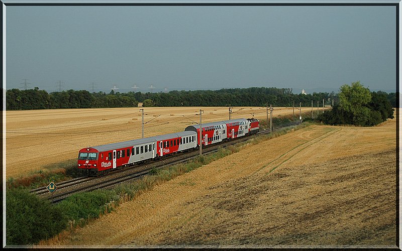 Aus einer eher ungewöhlichen Komposition bestand am 23.7.2006 der E 7626 von Bratislava nach Wien. Die Aufnahme entstand zwischen Gramatneusiedl und Himberg. Geschoben wurde dieser Eilzug von einer Lok der BR 1014,