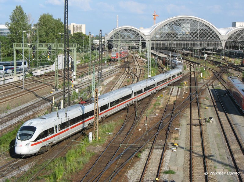 Ausfahrt ICE-T "Hansestadt Stralsund" und "Darmstadt" als ICE 1552 nach Frankfurt/Main. Im Hintergrund ein Zug der S-Bahn Meissen - Schöna (Sächsische Schweiz); Dresden Hbf, 14.07.2006