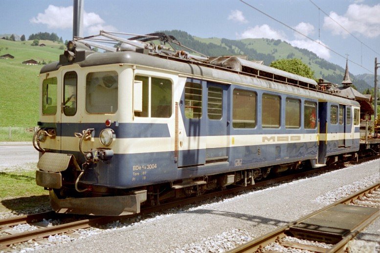 RhB - ABe 4/4 III 51 "POSCHIAVO" am 27.05.1990 in St.Moritz - Drehstromtriebwagen Bernina - Übernahme 11.04.1988 - SWA/SIG/ABB - 1016 KW - Gewicht 50,00t - 1./2.Klasse Sitzplätze 12/16 - LüP 16,89m - zulässige Geschwindigkeit 65 km/h - Logo RhB in italienisch. Hinweis: Die Triebfahrzeugserie besteht aus 6 Fahrzeugen mit den Nummern 51 bis 56, gescanntes Dia