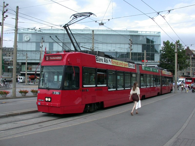Be 4/8 736 von BernMobil bedient die Linie 5 zum Fischermätteli, hier vor dem Hauptbahnhof Bern. (17.07.2003)