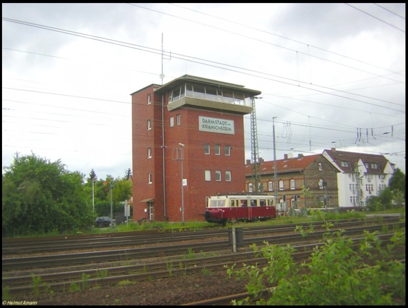 Bei den 7. Kranichsteiner Eisenbahntagen pendelte der Triebwagen VT 1 (Baujahr 1933 Waggonfabrik Wismar später T 141 ex Kleinbahn Lüchow-Schmarsau) von Darmstadt-Kranichstein zum Bessunger Forsthaus. Die Aufnahme zeigt den von Eisenbahnfreunden auch als Ameisenbär oder Schweineschnäuzchen bezeichneten Triebwagen am 27.05.2006 vor dem Stellwerk in Kranichstein.